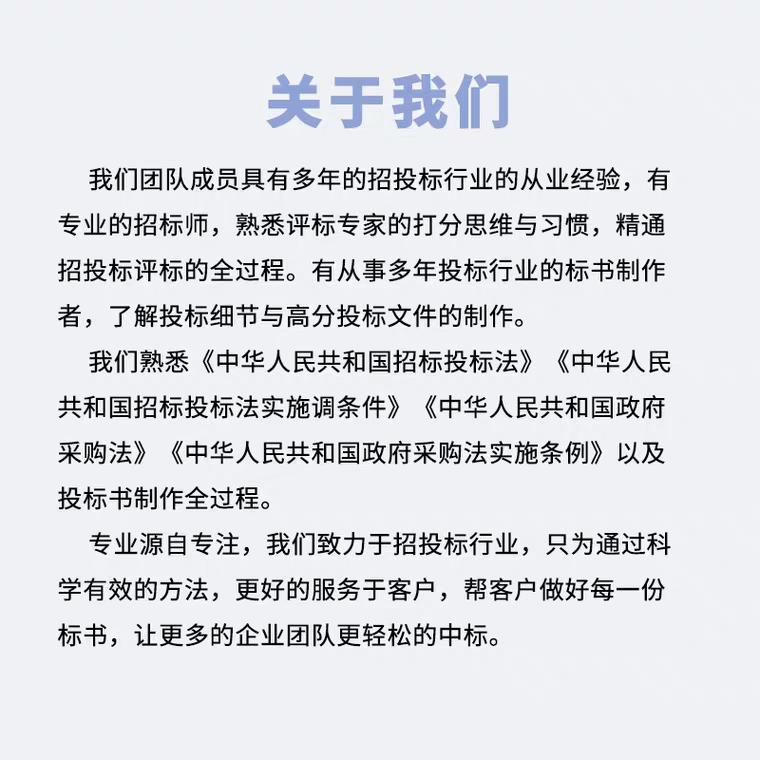 联盈标讯现有专业标书制作人员20多人,经济标、技术标、商务标人员均具有丰富的标书编制经验,各部分之间配合慎密,分工明确。用严谨的笔锋深深抓住评标专家的思路,严把质量关是我们对待标书行业的不变宗旨。